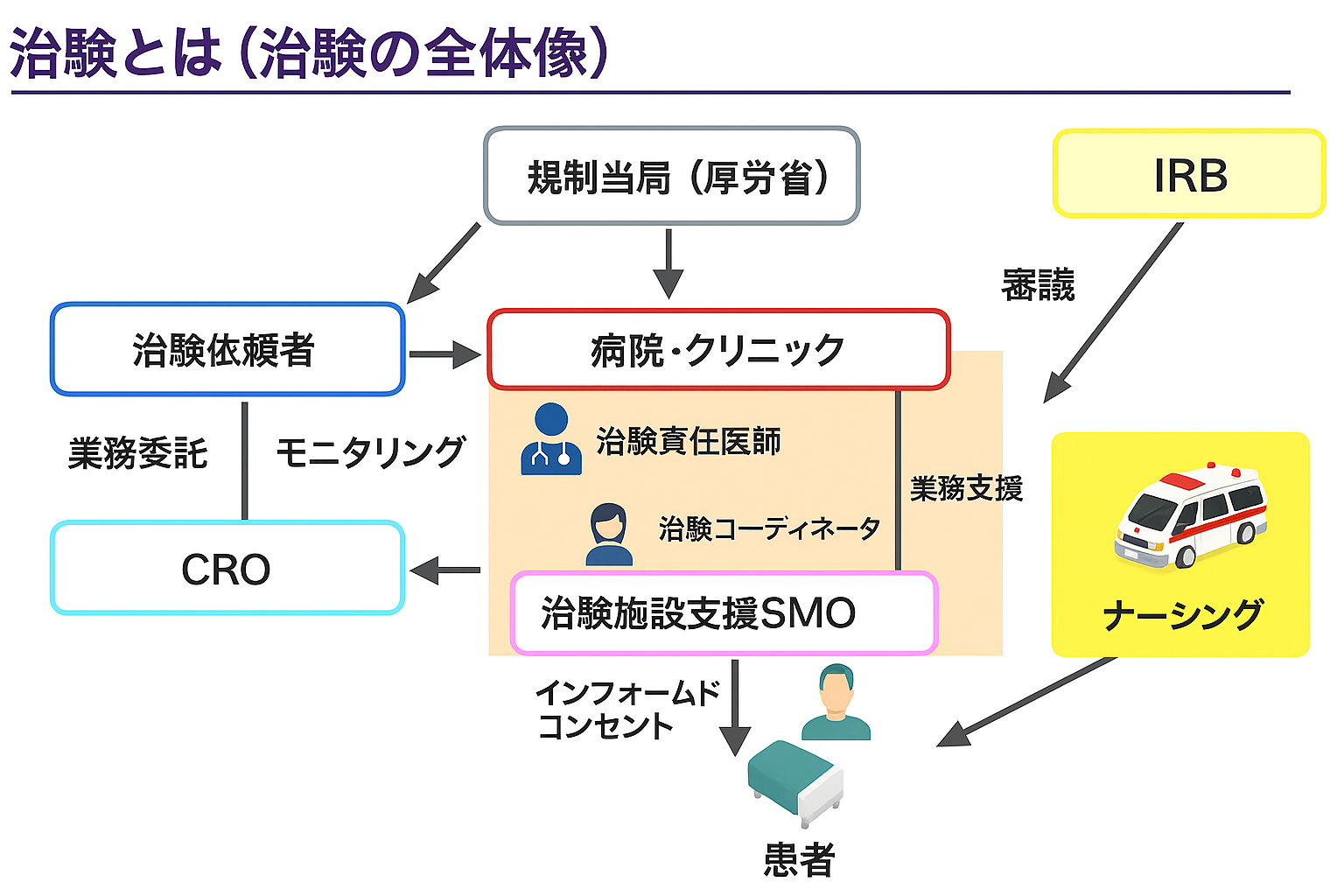 しかも、途中で辞めても不利益はありません。この治験を支えているのは、製薬会社、医師・看護師、治験コーディネーター、そして第三者機関であるIRB(治験審査委員会)など。